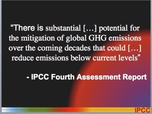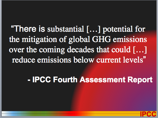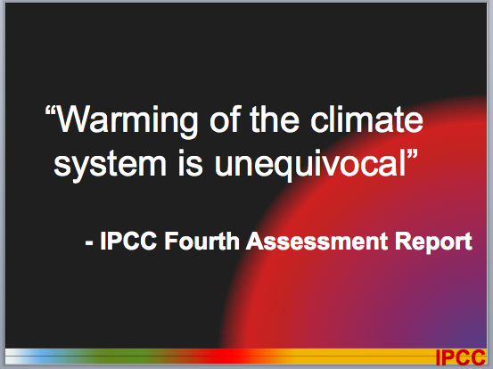 Straight to the point, with big words and legible fonts so even those in the back of the auditorium can read it. The bottom graphic containing the letters “IPCC” as a logo is unnecessary for its chairman to include, and merely clutters the boldness of the slide. This next slide is very appropriate too:
