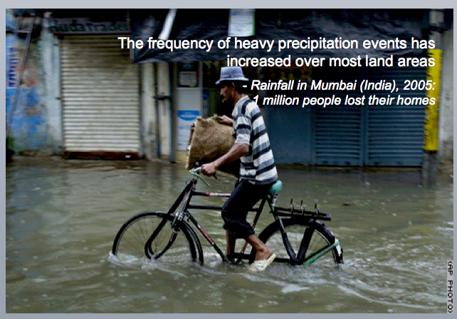 Again, the unnecessary IPCC logo continues to be conspicuous. This slide is taking a bet both ways: heaps of text, most likely read to judge by the notes accompanying the slide, but the visual images bear no immediate connection to the main message, and indeed by shoving them into the four corners in some effort at symmetry, only prove to be items of clutter. Certainly they form a boundary for the words, containing them, but in the end, they add nothing to the slide in a meaningful sense. For that reason, they make the audience work harder than they need to…