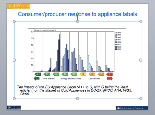 “Information and feedback are certainly one key to reducing household carbon emissions. This graphic from AR4 suggests that the introduction of appliance energy labels in Europe shifted the average purchase from a D to an A or B over a relatively short time period as both consumers and producers responded to the labelling programme saving considerable GHG emissions, but counteracted by larger fridges perhaps.”