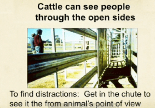 So something in the chutes the animals would move through to be vaccinated for instance might be overlooked by human eyes as a perfectly normal thing, such as a waving flag nearby, or a shadow cast across the floor, but to a cow it could cause fear to be experienced, thus releasing adrenaline and cortisol, affecting the meat.