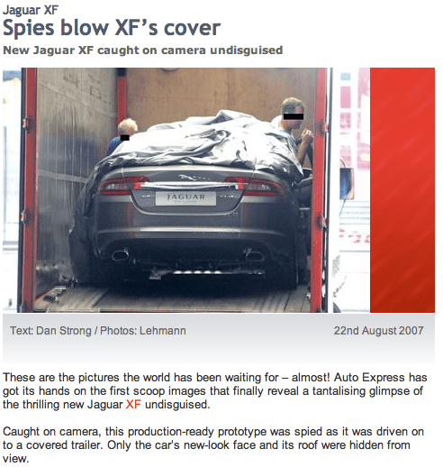 So let’s imagine for a moment the driver of the car, above, has taken it out for an evaluation drive. It’s clearly disguised so as not to reveal its final appearance, and in this case no effort is made to disguise the disguise, unlike the iPhone. For non-car watchers, its appearance might only be that of an unusual colour scheme and bonnet protector. For those who follow auto-manufacturing, the disguise is clear, and they might want to snap a few pictures with the car on the open road, and find an eager buyer, like an auto-paparazzi. No harm done, no laws broken, as long as no entry is unlawfully made to take pictures inside the car or under the hood. As it is, auto-journalists even camp out at test tracks hoping to get pictures of undisguised cars getting the full work out, and occasionally we see long-distance grainy shots on magazine covers, screaming “Scoop!” Take a look, below, at 2007 Autoexpress story of a new Jaguar model about to be released. It’s Spy vs Spy stuff! (Note too the effort of the magazine to protect the facial ID of the driver(s).)