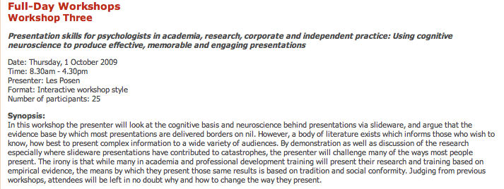 As a for instance: An attendee at my October 2009 Presentation Magic workshop to psychologists soon after invited me to present the same workshop to his group of which he was head of department. While this sounds easy, the real effort here is to once more understand this particular group’s needs, as well as their backgrounds as not all are psychologists. I also need to understand what he expects his group to learn, which might be quiet different from his own expectations at the time he enrolled in the October workshop. So what pleased him enough to invite me might not necessarily be on the money for his own group. This is his agenda and I need to be mindful of what he most liked about what I did, and how it can be extended and even “personalised” for his particular group, who are specialist therapists working with torture survivors in Australia.