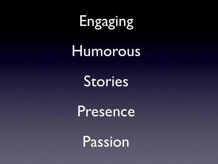 2. What’s in that bag of tricks? Here is one of my slides where I describe such “tricks”, actually qualities of the presenter: