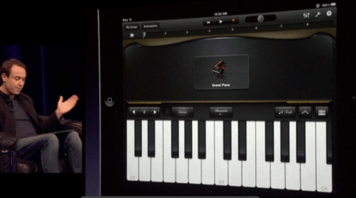As Xander takes us through several of Garageband’s instruments, those of us who might be getting a little concerned that we will miss out on all this fun because we’re unmusical are saved when he demoes how the software can help us create music with its built-in tools (This part of the demo starts about 54:20). What could have seen the presentation meander down an unhappy path is saved by another “Gee Whiz” demo of Smart Instruments, which wraps up his presentation. Watch how he emulates a text based slide by mentioning the name of the instrument and then sliding the iPad screen to the instrument in perfect synchrony: “We have smart guitars… (slide)… smart keyboards… (slide)… ..smart bass… (slide) .. smart drums…”