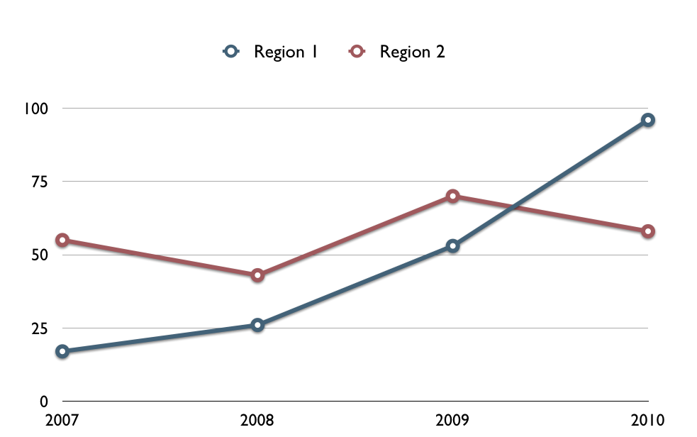 In the video below, I look at a very simple graph which is a Keynote default comparing two regions’ growth over a time period. What I’m interested in is the area between the lines, as you’ll see, below.