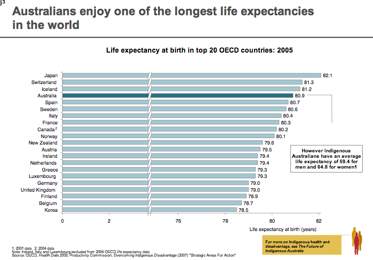 What I do like about it is that while the graph itself gets a header, the slide’s header tells the story: “Australians enjoy one of the longest life expectancies in the world.”