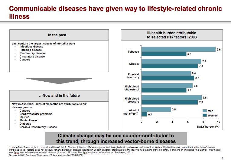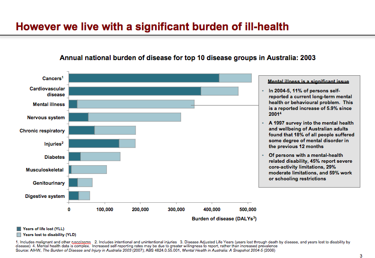 Personally, to highlight one of the areas, Mental Illness, I would have used different colour bars, as well as the text box over on the right. It’s interesting from a personal perspective to see how the slide mentions the rapid growth of mental illness, yet the new Health Minister is considering limitations to the population gaining access to psychologists as part of a new program initiated by the previous government.